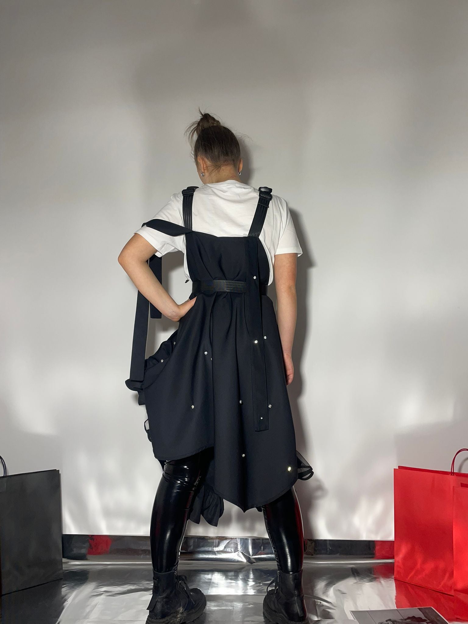 The straps are adaptable as well, you can wear the dress high or lower it down. Frill details as well as shiny crystals attached to the dress. We use technical fabric to make sure that this piece is durable and easy to maintain.